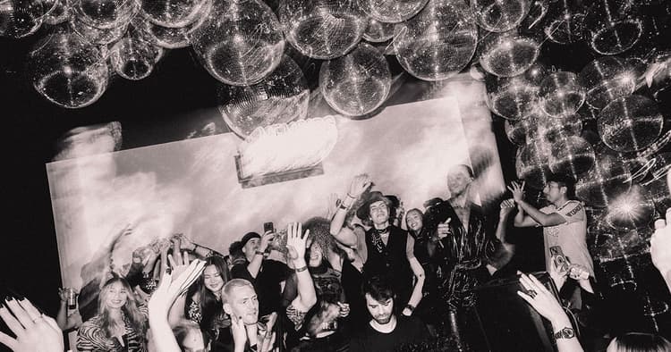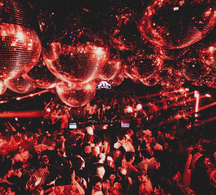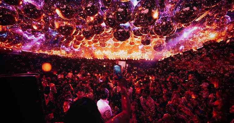 A vibrant and energetic bar with a dance floor that appears to be floating in the sky.